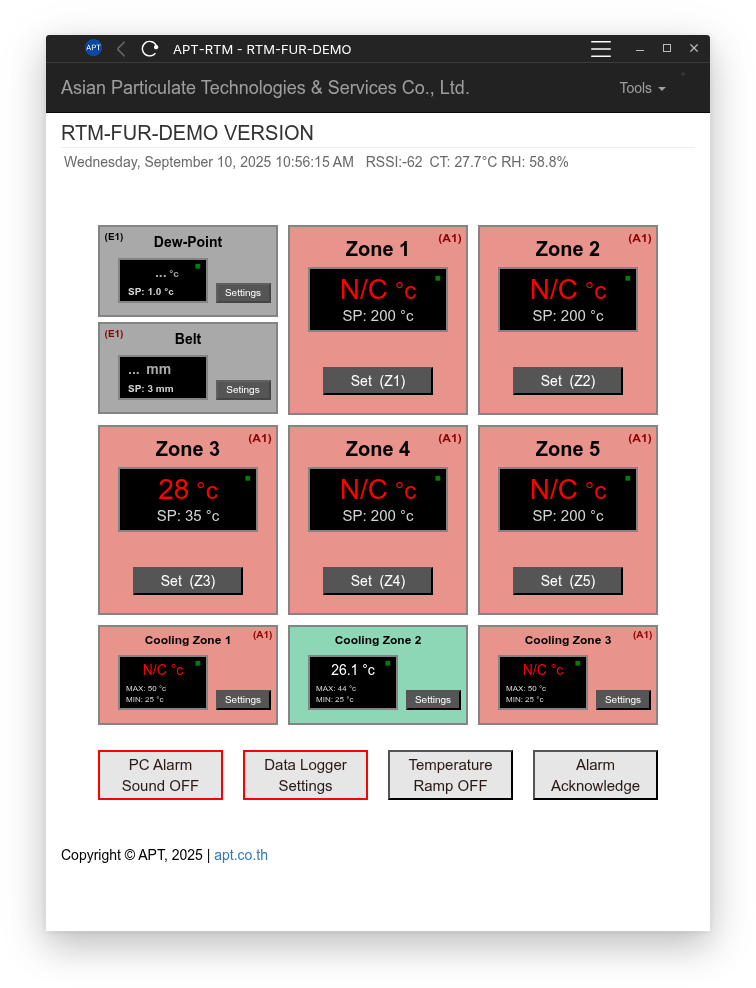 APT Real Time Monitor (RTM) and Web Application was Developed as a PC Based Operational Control Platform with Remote Monitoring & Database Recording Capabilities. Our System is Currently Configured for use with Multi Zone Sintering Furnaces. However, our Software & Sensors can be Adapted for use on a Variety of Industrial Equipment.